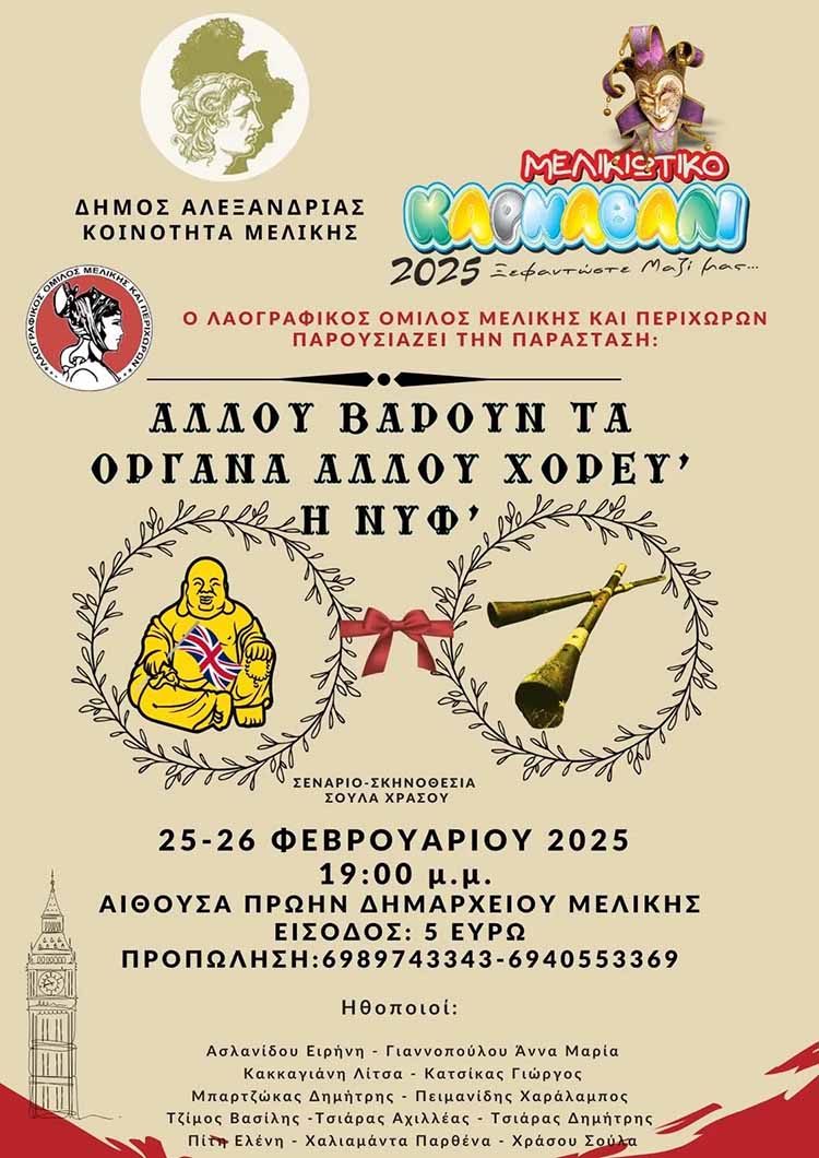 Μελίκη “Αλλού βαρούν τα όργανα, αλλού χορεύ η Νύφ’” – Θεατρικό στο πρώην Δημαρχείο Μελίκης (25 & 26 Φεβρουαρίου) Από Έμβολος - 25/02/2025 Ο Λαογραφικός Όμιλος Μελίκης και Περιχώρων παρουσιάζει την Παράσταση: “Αλλού βαρούν τα όργανα, αλλού χορεύ η Νύφ’” σε σκηνοθεσία Σούλας Χράσου 25 & 26 Φεβρουαρίου 19:00 Αίθουσα πρώην Δημαρχείου Μελίκης ΕΙΣΟΔΟΣ 5€