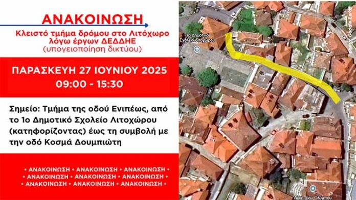 Σύμφωνα με ενημέρωση του ΔΕΔΔΗΕ, την Παρασκευή 27 Ιουνίου 2025 και ώρες 09:00-15:30 θα είναι κλειστό το τμήμα της οδού Ενιπέως στο Λιτόχωρο, από το 1ο Δημοτικό Σχολείο Λιτοχώρου (κατηφορίζοντας) έως τη συμβολή με την οδό Κοσμά Δουμπιώτη, λόγω των έργων υπογειοποίησης του δικτύου.