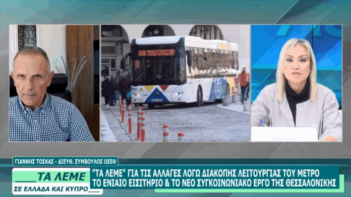 Για τους τρόπους αντιμετώπισης των προβλημάτων που θα προκύψουν στη μετακίνηση χιλιάδων επιβατών του μετρό, κατά τη διάρκεια διακοπής της λειτουργίας του από τις 10 Νοεμβρίου, για το νέο συγκοινωνιακό χάρτη της Π.Ε. Θεσσαλονίκης και τους σχεδιασμούς για καλύτερες μετακινήσεις στα Δυτικά της πόλης, μίλησε μεταξύ άλλων στην εκπομπή «ΤΑ ΛΕΜΕ», στη ΒΕΡΓΙΝΑ ΤΗΛΕΟΡΑΣΗ και στη δημοσιογράφο Χριστίνα Τσόρμπα ο Διευθύνων Σύμβουλος του ΟΣΕΘ Γιάννης Τόσκας.