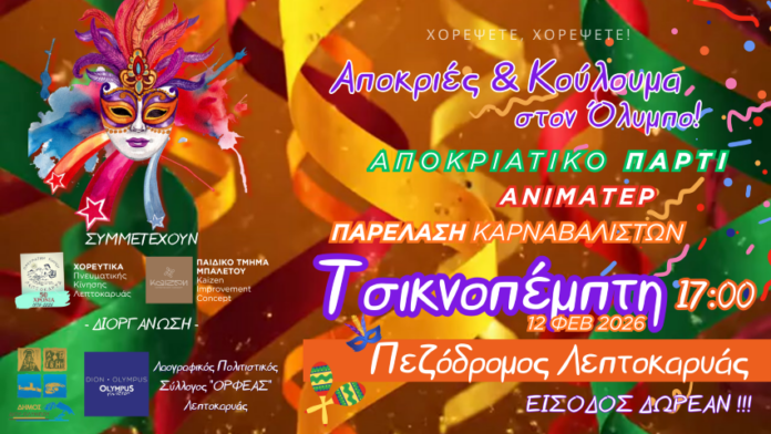Με ένα μεγάλο αποκριάτικο πάρτι στη Λεπτοκαρυά θα δοθεί το σήμα εκκίνησης των αποκριάτικων εκδηλώσεων του Δήμου Δίου-Ολύμπου «Αποκριές & Κούλουμα στον Όλυμπο 2026».