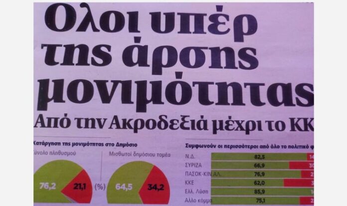 Στη δημοσκόπηση/έρευνα, αποτυπώνεται κάτι που δεν έχει συμβεί ποτέ! Η σύμφωνη γνώμη της κοινωνίας με συντριπτικό ποσοστό (76,2%), ώστε να καταργηθεί η μονιμότητα στο δημόσιο και να απολύονται οι ανεπαρκείς!!!