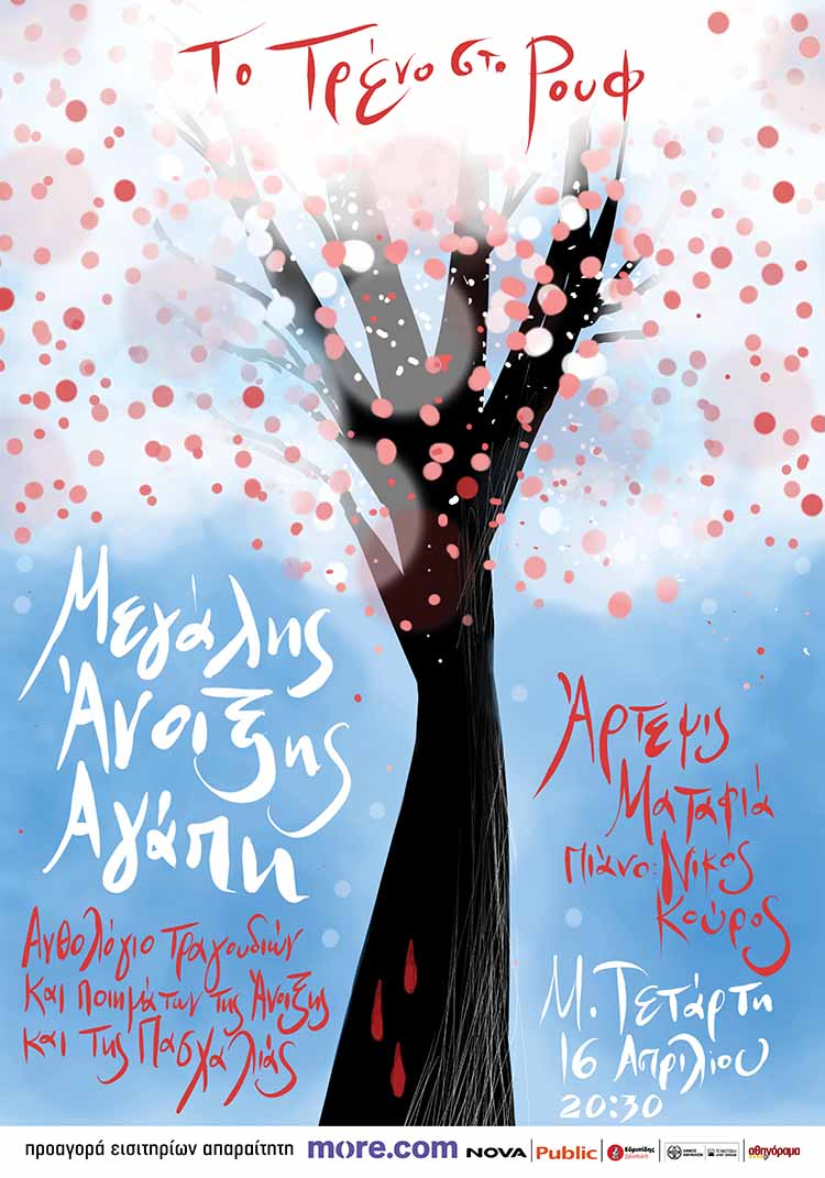 Μετά τις sold out παραστάσεις της φετινής χρονιάς «Μεγάλες κυρίες τραγουδούν…», η Άρτεμις Ματαφιά επιστρέφει στην Αμαξοστοιχία-Θέατρο το Τρένο στο Ρουφ και παρουσιάζει μια μοναδική, ανοιξιάτικη πρόταση για τη Μεγάλη Τετάρτη, 16 Απριλίου, στις 20:30. Η παράσταση «Μεγάλης Άνοιξης Αγάπη» είναι ένα οδοιπορικό τραγουδιών και ποίησης για την Άνοιξη, την Ελπίδα και την Αγάπη. Η αγαπημένη ερμηνεύτρια ανθολογεί ποιήματα αγαπημένων Ελλήνων και ξένων λογοτεχνών (Σεφέρη, Βάρναλη, Ελύτη, Λειβαδίτη, Δημουλά, Καζαντζάκη, Ρίτσου, Χαλίλ Γκιμπράν κ.ά.) και τραγούδια σπουδαίων συνθετών (Θεοδωράκη, Αρλέτας, Σπανού, Ζαμπέτα, Καλδάρα κ.ά.), και υποδέχεται την Άνοιξη προτείνοντας ένα μουσικοποιητικό ταξίδι ξεχωριστής τρυφερότητας, ευαισθησίας και αισιοδοξίας.