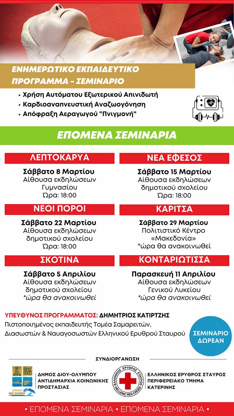 Τα ενημερωτικά σεμινάρια, που διεξάγονται δωρεάν σε κάθε δημοτική κοινότητα, είναι μία συνδιοργάνωση της Αντιδημαρχίας Κοινωνικής Προστασίας του Δήμου Δίου-Ολύμπου σε συνεργασία με το Περιφερειακό Τμήμα Κατερίνης του Ελληνικού Ερυθρού Σταυρού.