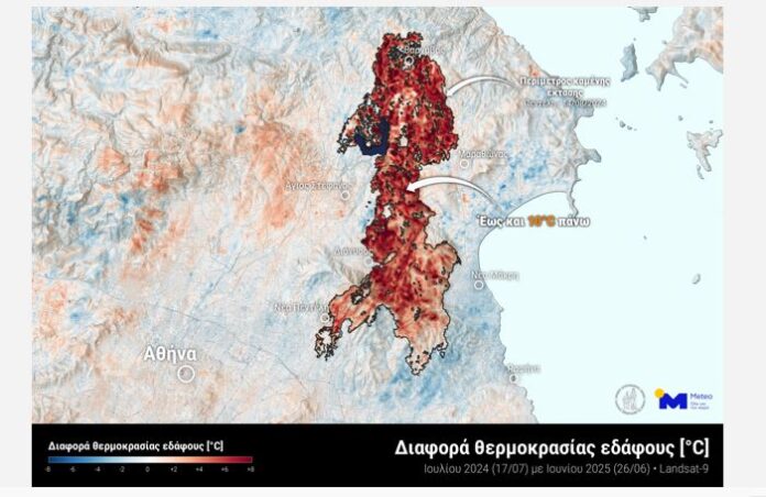 Ωστόσο, ιδιαίτερο ενδιαφέρον παρουσιάζει η περιοχή που επλήγη από τη μεγάλη πυρκαγιά του Αυγούστου 2024, καθώς όπως αποτυπώνεται σε σχετικό χάρτη, εντός των ορίων της καμένης έκτασης, οι τιμές της θερμοκρασίας εδάφους τον Ιούνιο του 2025 εμφανίζονται αυξημένες έως και 10°C σε σύγκριση με τις αντίστοιχες του Ιουλίου 2024, πριν την πυρκαγιά. Παρά την παρέλευση σημαντικού χρονικού διαστήματος, όπως τονίζει η μονάδα ΜΕΤΕΟ, η απώλεια της βλάστησης εξακολουθεί να έχει ισχυρή επίδραση στην ενεργειακή ισορροπία της περιοχής, οδηγώντας σε σημαντική επιφανειακή θέρμανση.