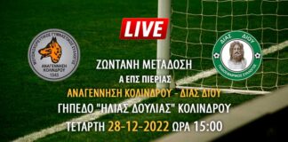 Ζωντανή μετάδοση αγώνα Α ΕΠΣ Πιερίας: Αναγέννηση Κολινδρού – Δίας Δίου