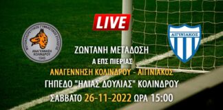 Ζωντανή μετάδοση αγώνα Α ΕΠΣ Πιερίας: Αναγέννηση Κολινδρού – Αιγινιακός
