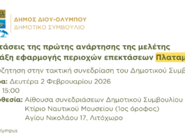 Δήμος Δίου-Ολύμπου: Στο Δημοτικό Συμβούλιο προς συζήτηση οι ενστάσεις της πρώτης ανάρτησης της μελέτης «Πράξη εφαρμογής περιοχών επεκτάσεων Πλαταμώνα» τη Δευτέρα 2 Φεβρουαρίου 2026