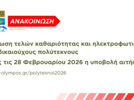 Δήμος Δίου-Ολύμπου: Μείωση τελών καθαριότητας και ηλεκτροφωτισμού σε δικαιούχους πολύτεκνους – Υποβολή αιτήσεων έως 28 Φεβρουαρίου 2026
