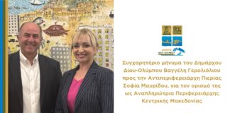 Συγχαρητήριο μήνυμα του Δημάρχου Βαγγέλη Γερολιόλιου προς την Αντιπεριφερειάρχη Πιερίας Σοφία...