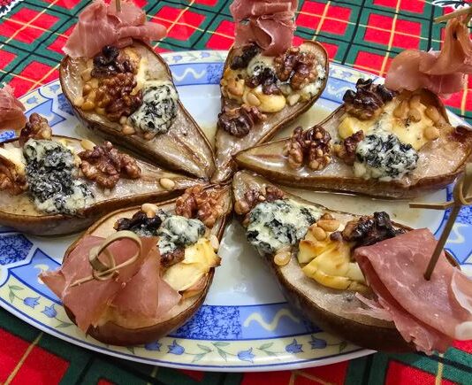 Αχλάδια ψητά με ροκφόρ, μέλι και προσούτο – Γεύση γιορτής
