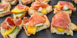 Μπρουσκέτα με ροδάκινο, μοτσαρέλα και προσούτο