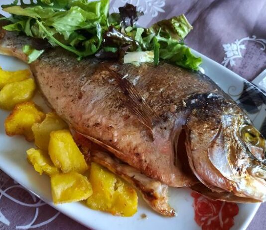 Τσιπούρες στο φούρνο με πατάτες τηγανητές και βρασμένες