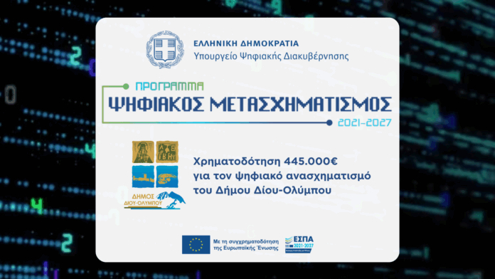 Με το ποσό των 445.000 ευρώ θα χρηματοδοτηθεί ο Δήμος Δίου-Ολύμπου, με απόφαση του υπουργού Ψηφιακής Διακυβέρνησης, Δημήτρη Παπαστεργίου, στο πλαίσιο του προγράμματος «Ψηφιακός Μετασχηματισμός 2021-2027».