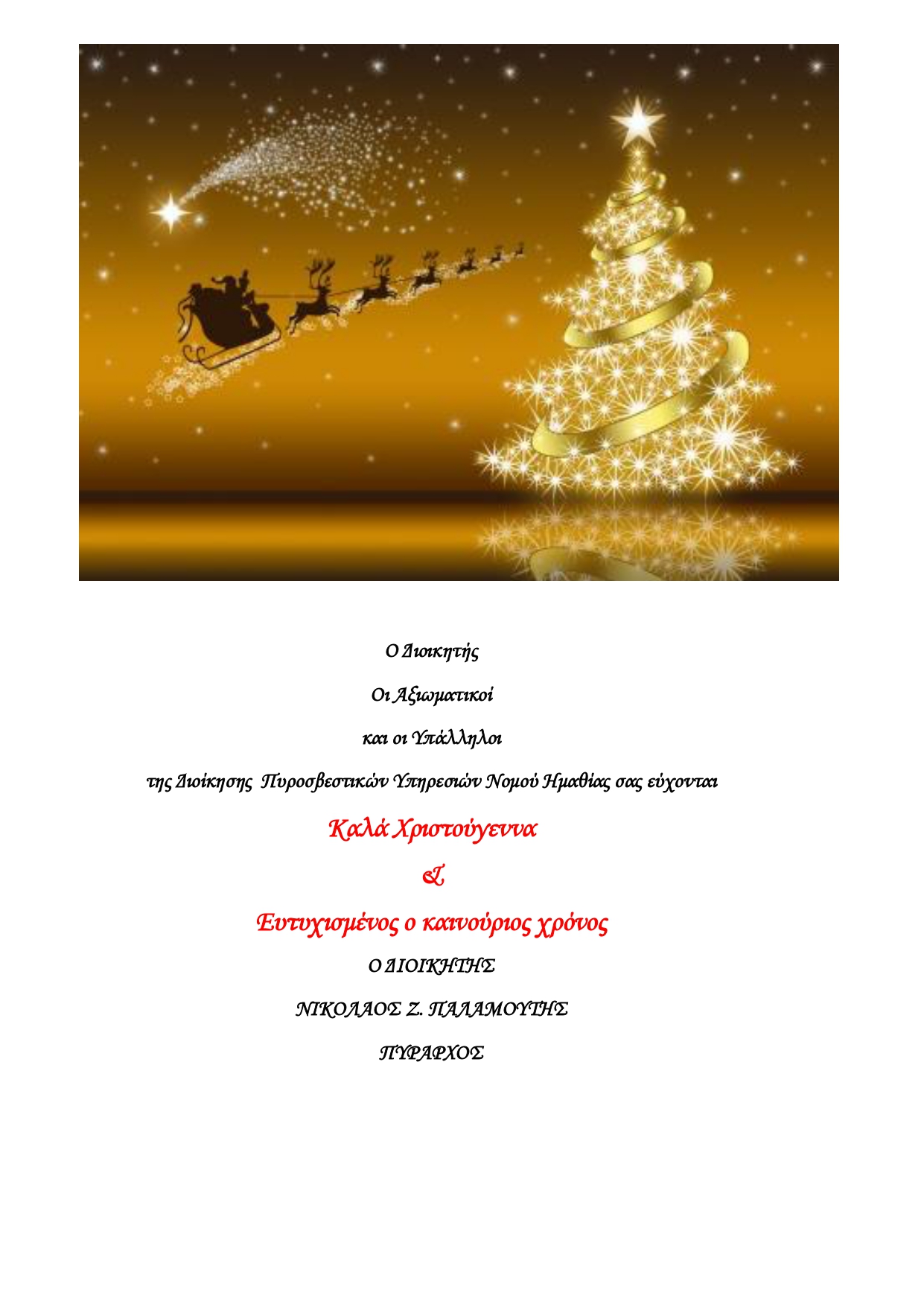 Ο Διοικητής Οι Αξιωματικοί και οι Υπάλληλοι της Διοίκησης Πυροσβεστικών Υπηρεσιών Νομού Ημαθίας σας εύχονται Καλά Χριστούγεννα & Ευτυχισμένος ο καινούριος χρόνος!