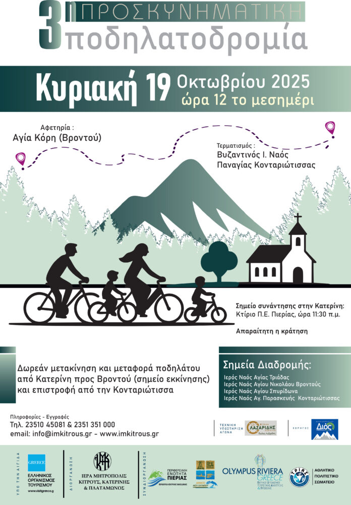 Την Κυριακή 19 Οκτωβρίου 2025 και ώρα 12 το μεσημέρι θα πραγματοποιηθεί η «3η ΠΡΟΣΚΥΝΗΜΑΤΙΚΗ ΠΟΔΗΛΑΤΟΔΡΟΜΙΑ» που διοργανώνει η Ιερά Μητρόπολη Κίτρους με την Π.Ε. Πιερίας, τον Δήμο Δίου-Ολύμπου, τον Πιερικό Οργανισμό Τουριστικής Ανάπτυξης και Προβολής (Π.Ο.Τ.Α.Π.) και τον Α.Π.Σ. ”ΤΡΙΑΣ” .