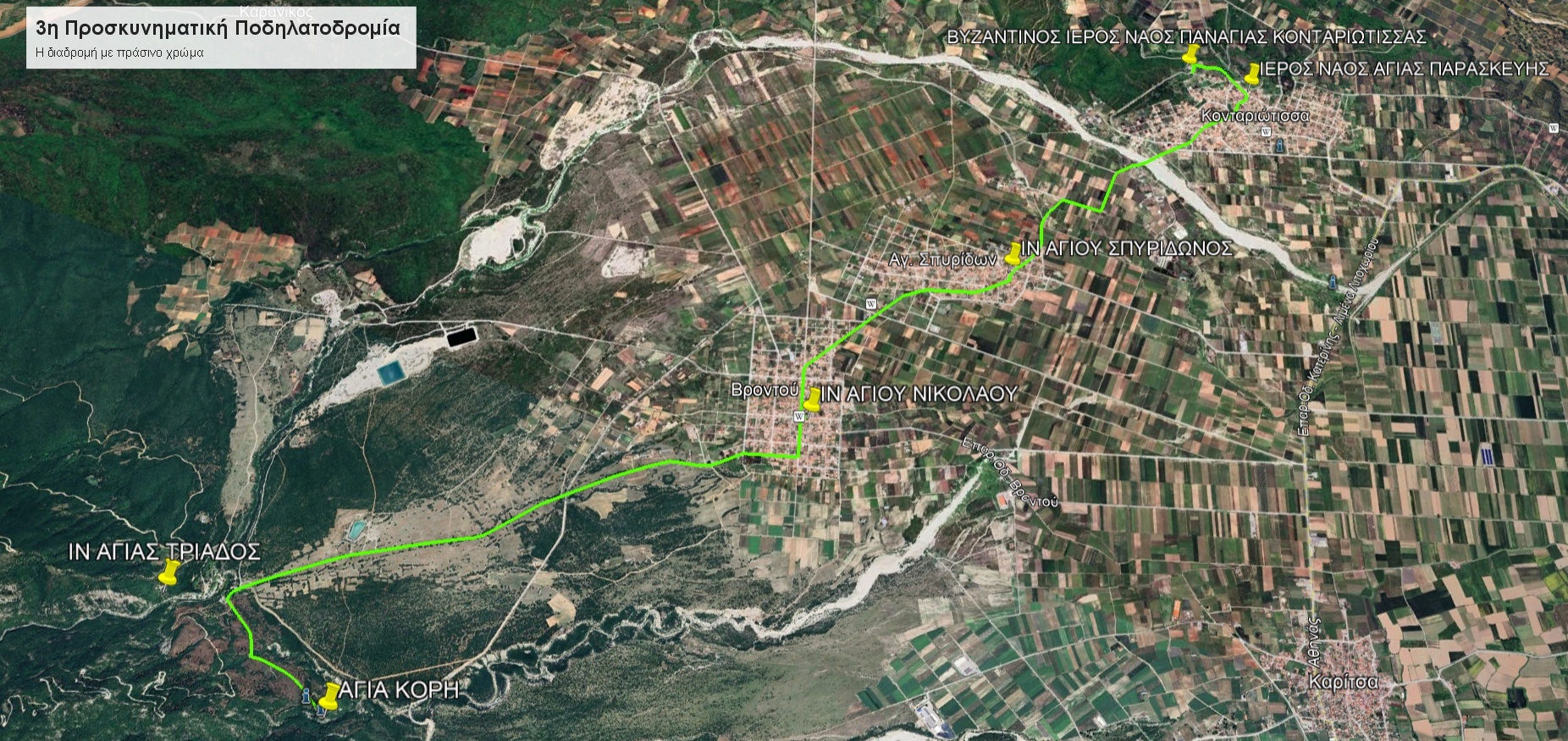 - Σημείο τερματισμού: Βυζαντινός Ιερός Ναός Κοίμησης της Θεοτόκου στην Κονταριώτισσα.