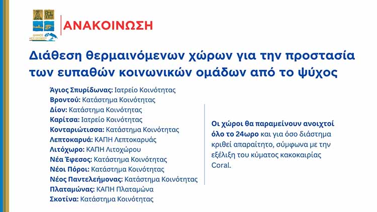 Ο Δήμος Δίου-Ολύμπου ανακοινώνει ότι διατίθενται οι ακόλουθοι θερμαινόμενοι χώροι για την προστασία των ευπαθών κοινωνικών ομάδων από το ψύχος: