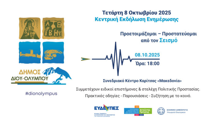 Ο Δήμος Δίου–Ολύμπου, στο πλαίσιο του Προγράμματος «Αντώνης Τρίτσης», διοργανώνει την κεντρική εκδήλωση ενημέρωσης και ευαισθητοποίησης πολιτών για την αντισεισμική προστασία με τίτλο «Προετοιμάζομαι – Προστατεύομαι από τον Σεισμό».