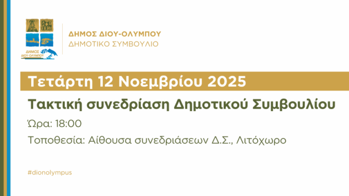 Καλείστε στην τακτική συνεδρίαση του Δημοτικού Συμβουλίου, στο δημοτικό κατάστημα στην κοινότητα Λιτοχώρου στις 12/11/2025 ημέρα Τετάρτη και ώρα 18:00 για συζήτηση και λήψη απόφασης για τα παρακάτω θέματα της ημερήσιας διάταξης, βάσει των διατάξεων του άρθρου 67 παρ. 5 του Ν. 3852/2010 με τίτλο «Σύγκληση του Δημοτικού Συμβουλίου».