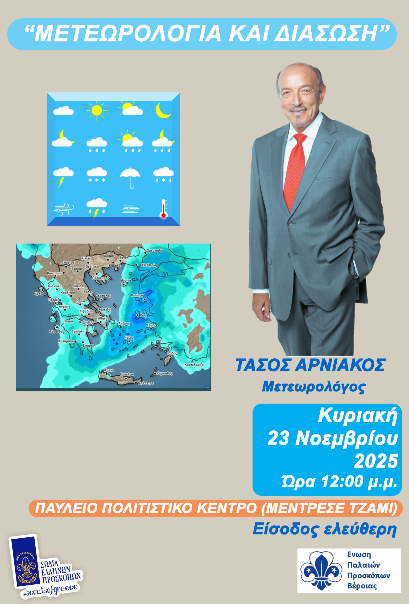 Η Ένωση Παλαιών Προσκόπων Βέροιας σας προσκαλεί την Κυριακή 23 Νοεμβρίου 2025 στο Παύλειο Πολιτιστικό Κέντρο – Μεντρεσέ Τζαμί και ώρα 12:00 μ.μ. να παρακολουθήσετε μια εξειδικευμένη παρουσίαση με θέμα: «Μετεωρολογία και Διάσωση».