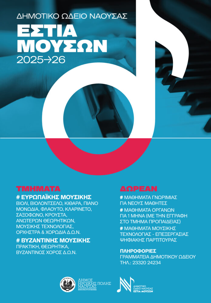 Το Δημοτικό Ωδείο Νάουσας “Εστία Μουσών” για άλλη μια χρονιά, ανοίγει την «αγκαλιά του» σε όλους όσοι, ανεξαρτήτου ηλικίας και επιπέδου, θέλουν να γνωρίσουν τον μαγικό κόσμο της Μουσικής και του Χορού.