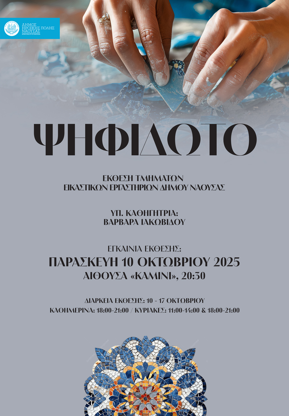 – Έκθεση των τμημάτων Ψηφιδωτού με υπεύθυνη διδασκαλίας την κ. Βαρβάρα Ιακωβίδου. Τα εγκαίνια θα γίνουν θα γίνουν την Παρασκευή 10 Οκτωβρίου και ώρα 20:30 στην αίθουσα “Καμίνι”. Διάρκεια Έκθεσης: 10 – 17 Οκτωβρίου. Λόγω κωλύματος, δεν θα πραγματοποιηθεί η έκθεση του τμήματος Κοσμήματος.