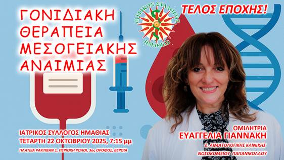 Ο Ιατρικός Σύλλογος Ημαθίας (ΙΣΗ) θα πραγματοποιήσει την Τετάρτη 22 Οκτωβρίου 2025 και ώρα 7.00 μμ, ενημερωτική συνάντηση, με θέμα: “ΓΟΝΙΔΙΑΚΗ ΘΕΡΑΠΕΙΑ ΓΙΑ ΑΣΘΕΝΕΙΣ ΜΕ ΕΞΑΡΤΩΜΕΝΗ ΑΠΟ ΜΕΤΑΓΓΙΣΕΙΣ ΜΕΣΟΓΕΙΑΚΗ ΑΝΑΙΜΙΑ: ΤΕΛΟΣ ΕΠΟΧΗΣ”