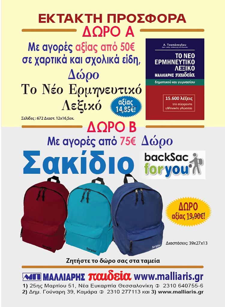 • Με αγορές αξίας από 50€ δίδεται δώρο “Το Νέο Ερμηνευτικό Λεξικό ΜΑΛΛΙΑΡΗΣ-παιδεία” του Α. Τσοπάνογλου, για μαθητές δημοτικού και γυμνασίου, με 15.600 λέξεις, σελ. 672, διαστ. 12χ16,5 εκ., αξίας 14,85€!
