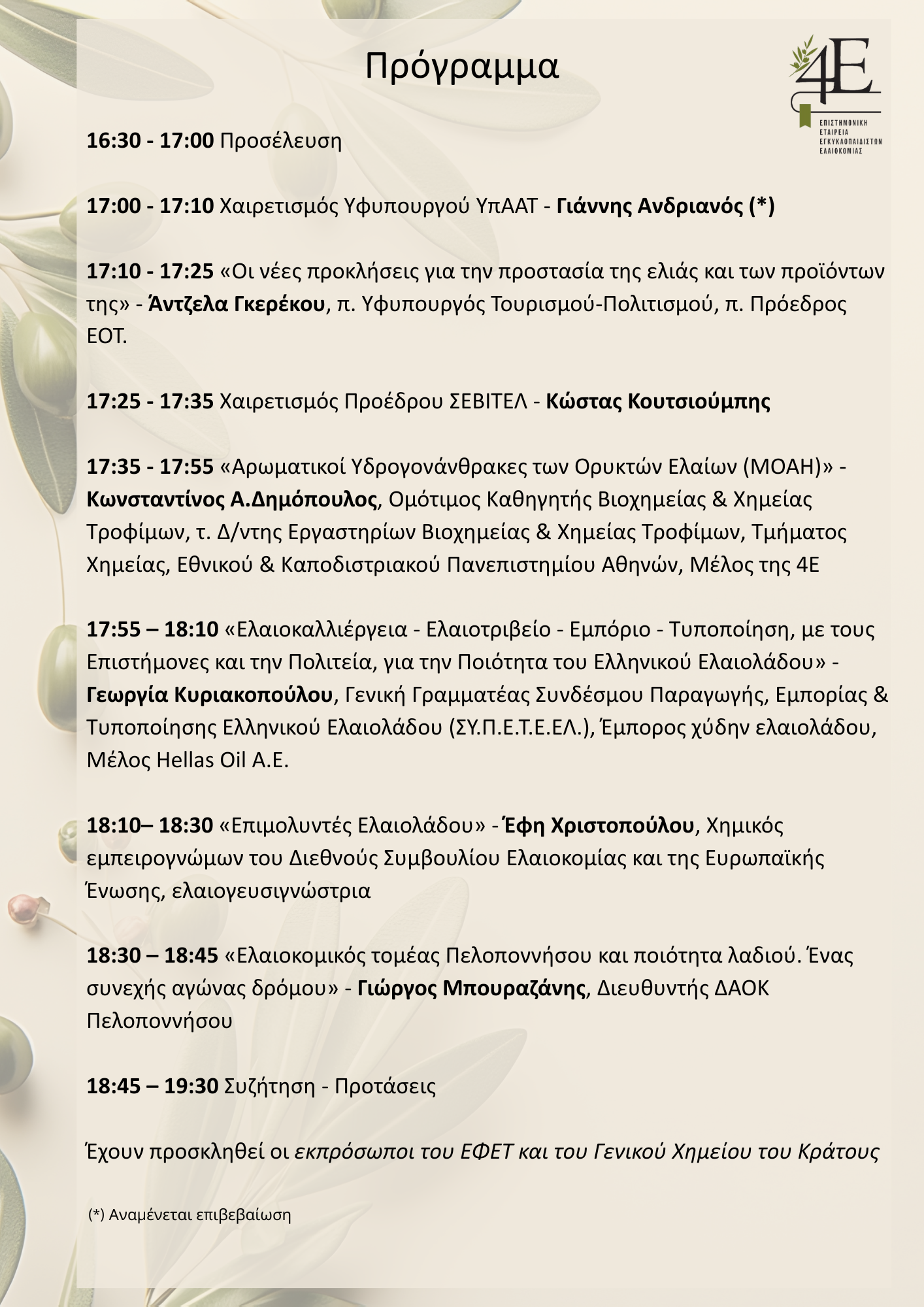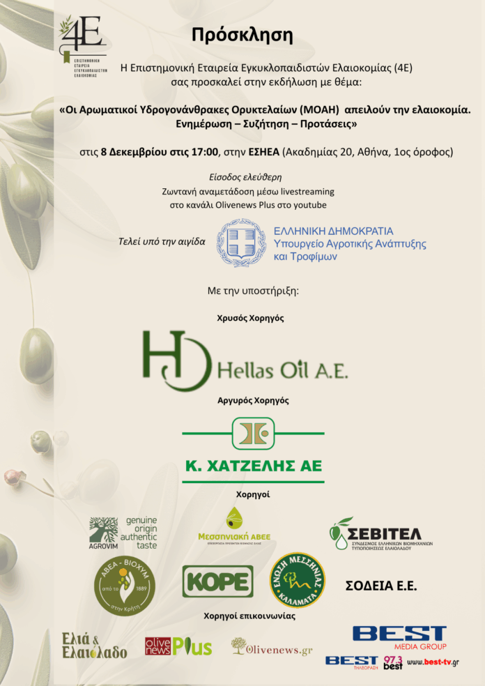 Η Επιστημονική Εταιρεία Εγκυκλοπαιδιστών Ελαιοκομίας (4Ε) διοργανώνει ενημερωτική εκδήλωση με θέμα:«Οι Αρωματικοί Υδρογονάνθρακες Ορυκτελαίων (MOAH) απειλούν την ελαιοκομία. Ενημέρωση – Συζήτηση – Προτάσεις».