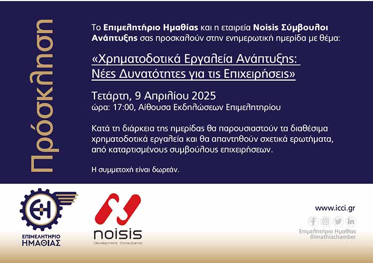 Το Επιμελητήριο Ημαθίας και η Εταιρεία Συμβούλων Noisis Σύμβουλοι Ανάπτυξης A.E. διοργανώνουν ενημερωτική ημερίδα με θέμα την παρουσίαση των σύγχρονων χρηματοδοτικών εργαλείων που είναι διαθέσιμα για την ενίσχυση των επιχειρήσεων.