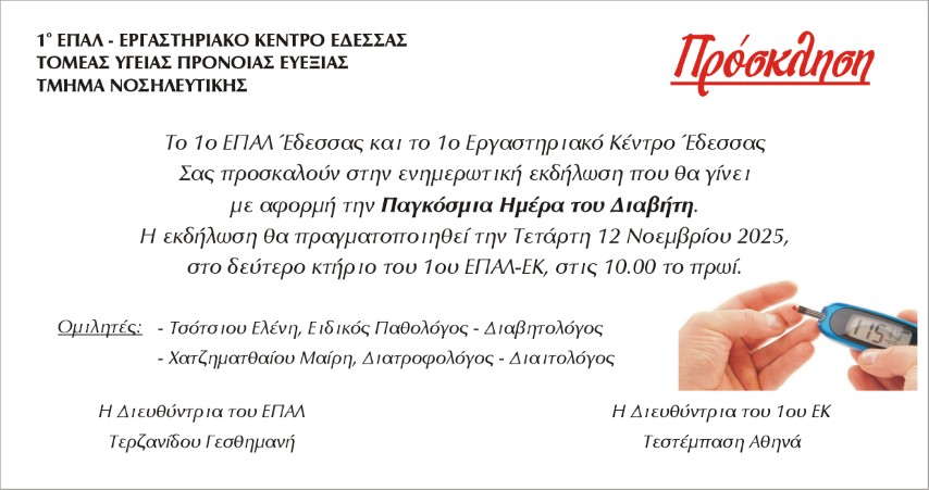 Στα πλαίσια της ίδιας δράσης θα πραγματοποιηθεί εκδήλωση -ομιλία την Τετάρτη 12 Νοεμβρίου 2024 στο “φουαγιέ του ΕΠΑΛ Έδεσσας(κτίριο δίπλα στον Σκλαβενίτη). Στην εκδήλωση η οποία θα αρχίσει στις 10.00, θα μιλήσουν οι κκ. Τσιότσιου Ελένη Ειδικός Παθολόγος – Διαβητολόγος και Χατζηματθαίου Μαίρη Διαιτολόγος Διατροφολόγος .