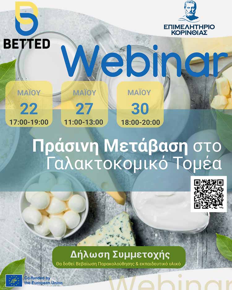| Το Επιμελητήριο Κορινθίας, στο πλαίσιο του ευρωπαϊκού έργου BETTED – Boosting the Energy Transition of the Dairy Value Chain, σας προσκαλεί να συμμετάσχετε σε ένα δωρεάν διαδικτυακό εκπαιδευτικό σεμινάριο (webinar) με θέμα: «Ενίσχυση της Ενεργειακής Μετάβασης στην Αλυσίδα Αξίας του Γαλακτοκομικού Τομέα»