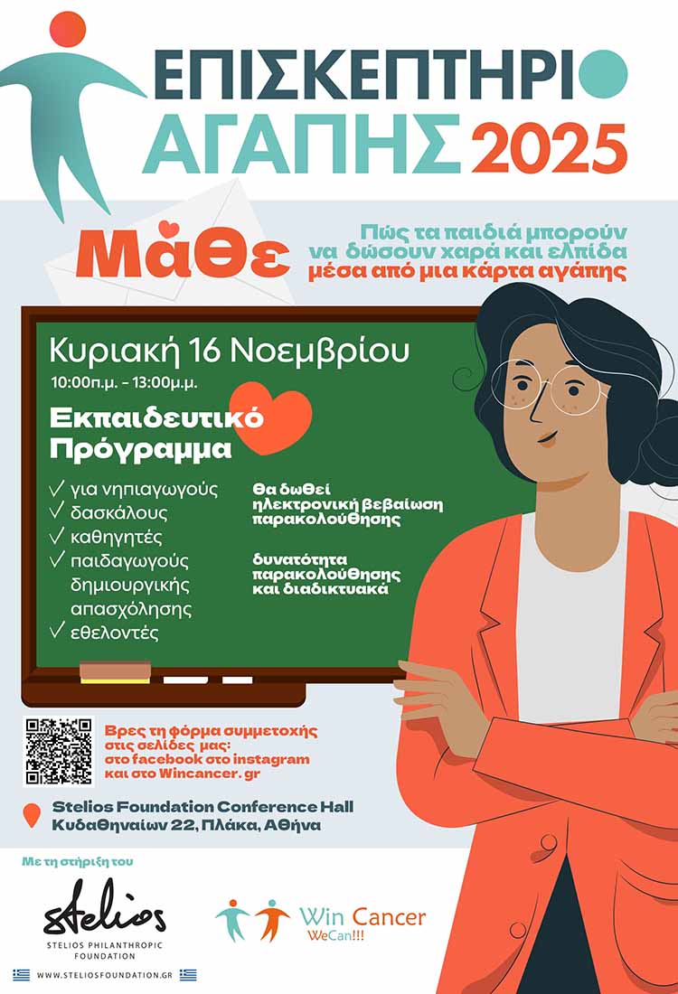 Η Αστική Μη Κερδοσκοπική Εταιρεία WinCancer ανακοινώνει τη διοργάνωση του εκπαιδευτικού προγράμματος “Επισκεπτήριο Αγάπης 2025”, που θα πραγματοποιηθεί με την στήριξη του Stelios Philanthropic Foundation την Κυριακή 16 Νοεμβρίου 2025, ώρες 10:00–13:00, στην αίθουσα Stelios Foundation Conference Hall (Κυδαθηναίων 22, Πλάκα, Αθήνα).