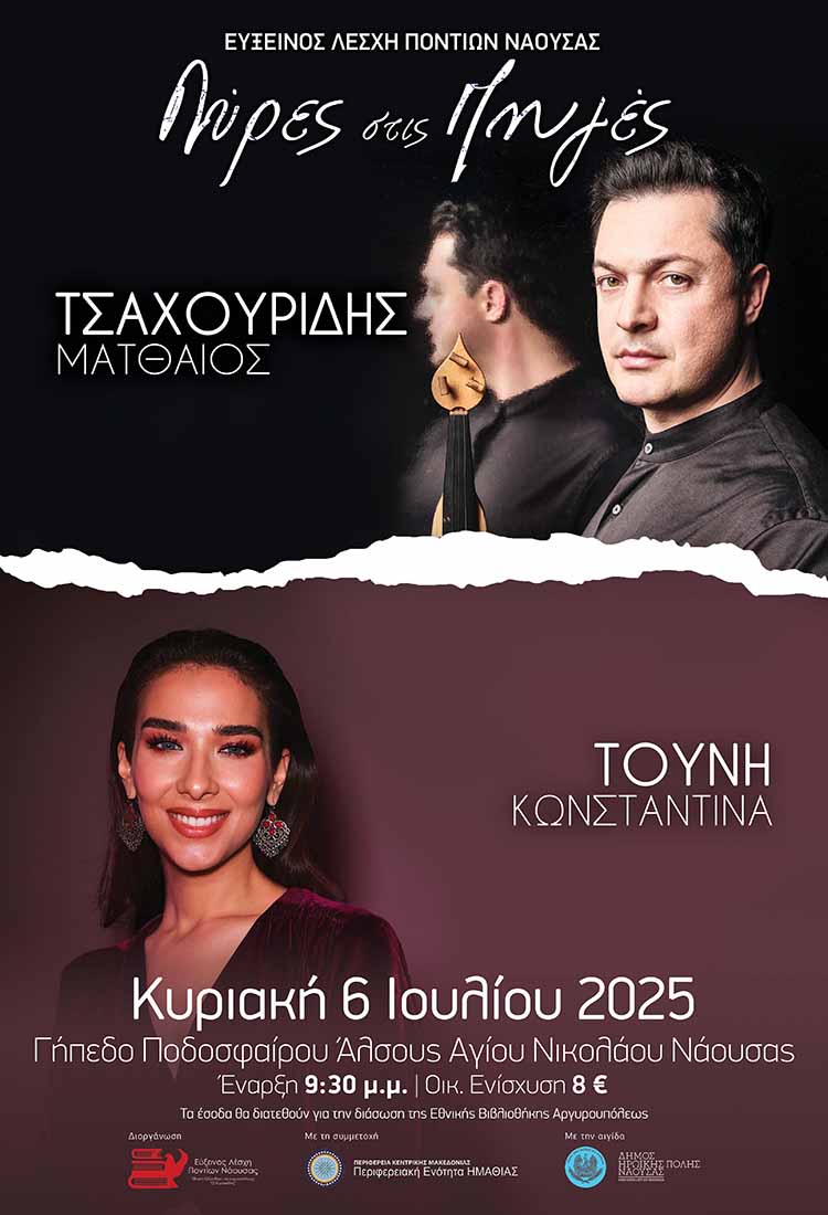 Οι Λύρες στις Πηγές επιστρέφουν για 7η χρονιά από την Εύξεινο Λέσχη Ποντίων Νάουσας, αυτή την φορά στο Γήπεδο Ποδοσφαίρου του Άλσους Αγίου Νικολάου Νάουσας, την Κυριακή 6 Ιουλίου 2025.