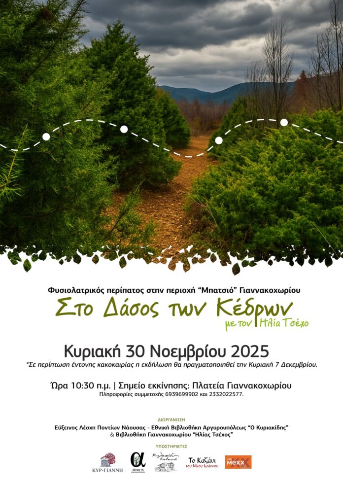 Η Εύξεινος Λέσχη Ποντίων Νάουσας – Εθνική Βιβλιοθήκη Αργυρουπόλεως «Ο Κυριακίδης», με τη Βιβλιοθήκη Γιαννακοχωρίου «Ηλίας Τσέχος» και με οδηγό τον Ηλία Τσέχο, συνδιοργανώνουν θεματική περιπατητική διαδρομή στο Δάσος των Κέδρων στο Γιαννακοχώρι, την Κυριακή 30 Νοεμβρίου. Η συγκέντρωση των συμμετεχόντων έχει οριστεί για τις 10:30 π.μ. με σημείο εκκίνησης την Πλατεία Γιαννακοχωρίου.