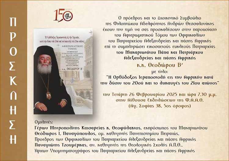 Έχουμε την τιμή να σας προσκαλέσουμε στην παρουσίαση του Αφιερωματικού Τόμου των Οφφικιαλίων του Πατριαρχείου Αλεξανδρείας και πάσης Αφρικής