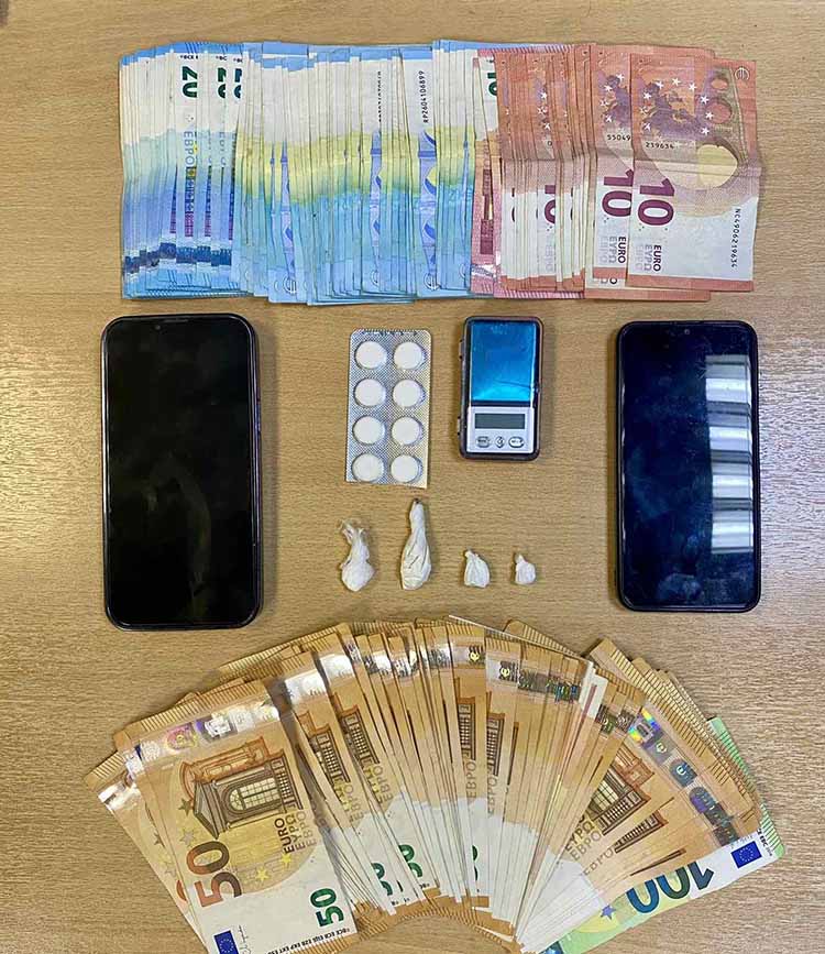 • 4 συσκευασίες με κοκαΐνη, συνολικού βάρους 2,5 γραμμαρίων, • 1 ηλεκτρονική ζυγαριά ακριβείας, • το χρηματικό ποσό των 5.070 ευρώ, • 8 χάπια, χωρίς την απαιτούμενη ιατρική συνταγή και • 1 κινητό τηλέφωνο. Επίσης από την κατοχή του κατασχέθηκε ακόμη ένα κινητό τηλέφωνο |