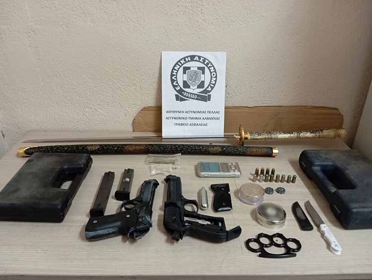 | Σύλληψη για παραβάσεις της νομοθεσίας περί όπλων και περί ναρκωτικών | Συνελήφθη προχθές (7 Απριλίου 2025) το μεσημέρι σε περιοχή της Πέλλας, από αστυνομικούς του Αστυνομικού Τμήματος Αλμωπίας, ημεδαπός άνδρας καθώς σε έρευνα του οχήματος που οδηγούσε βρέθηκε και κατασχέθηκε ένα μαχαίρι. Επίσης στην οικία του σε περιοχή της Πέλλας διαπιστώθηκε να αποκρύπτει: