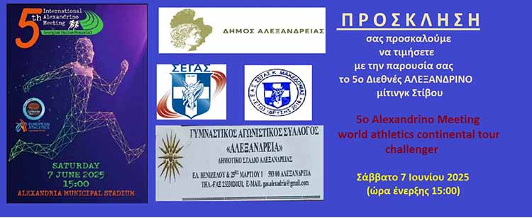 Αθλητισμός Γυμναστικός Αγωνιστικός Σύλλογος Αλεξάνδρεια: 5o Διεθνές Αλεξάνδρινό Meeting Στίβου Από Έμβολος - 05/06/2025 5o Διεθνές Αλεξάνδρινό Meeting Στίβου