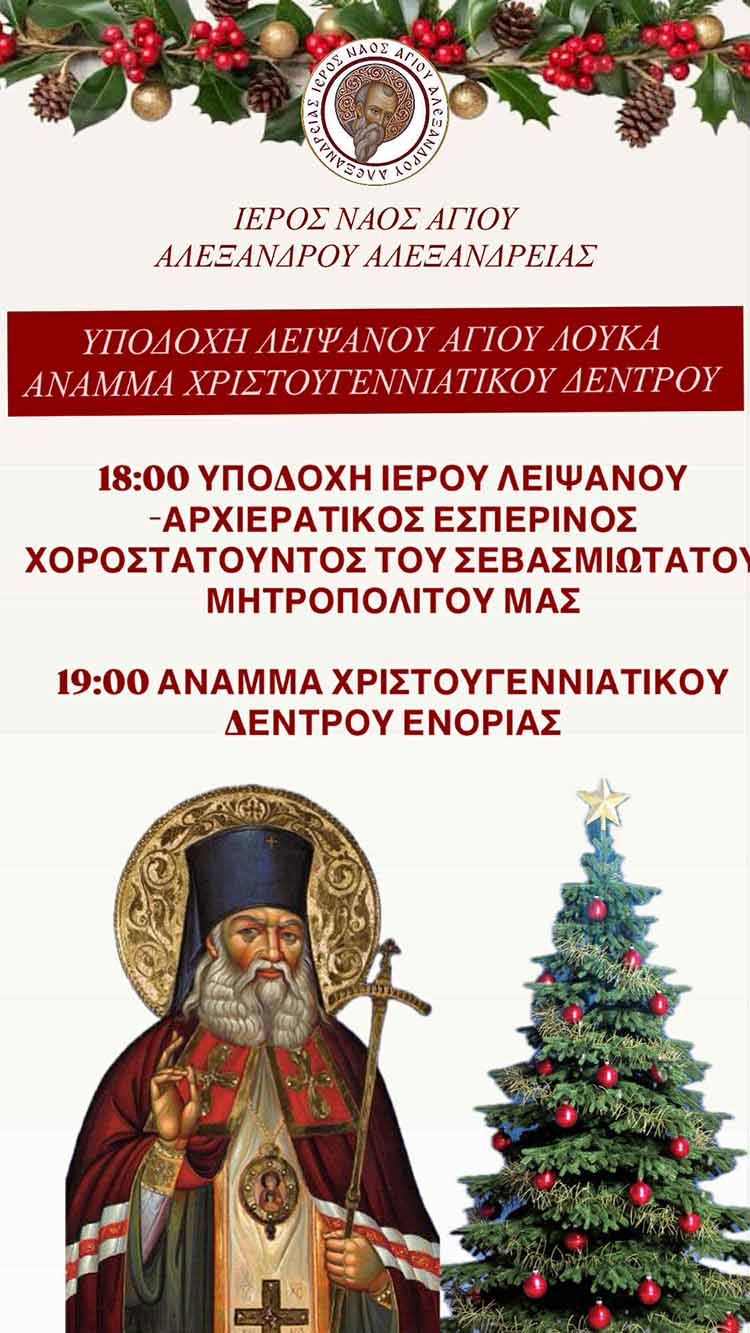 Εκκλησία Ι.Ν. Αγίου Αλεξάνδρου Αλεξάνδρειας: Υποδοχή Λειψάνου Αγίου Λουκά και άναμμα Χριστουγεννιάτικου δέντρου. Από Έμβολος - 06/12/2025 Υποδοχή λειψάνου Αγίου Λουκά και άναμμα χριστουγεννιάτικου δέντρου