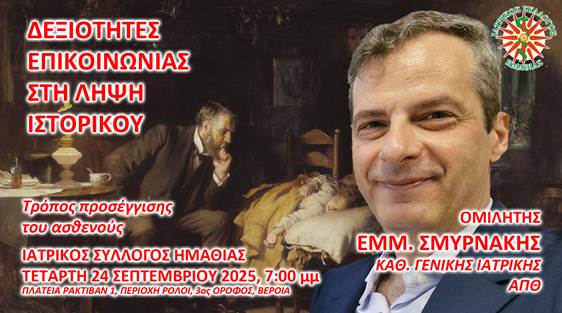 Ο Ιατρικός Σύλλογος Ημαθίας (ΙΣΗ) σας προσκαλεί στην επόμενη εκπαιδευτική του συνάντηση, η οποία θα πραγματοποιηθεί την Τετάρτη 24 Σεπτεμβρίου 2025 και ώρα 19:00 (7.00 μμ), με θέμα: