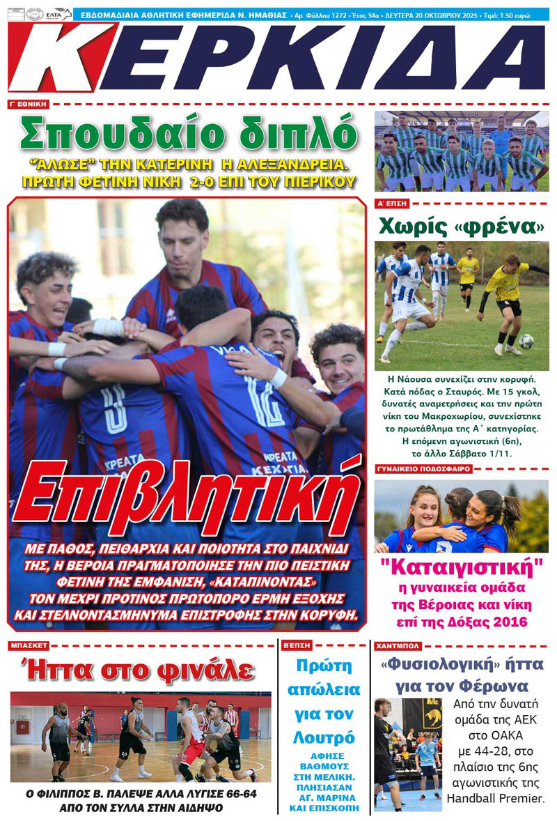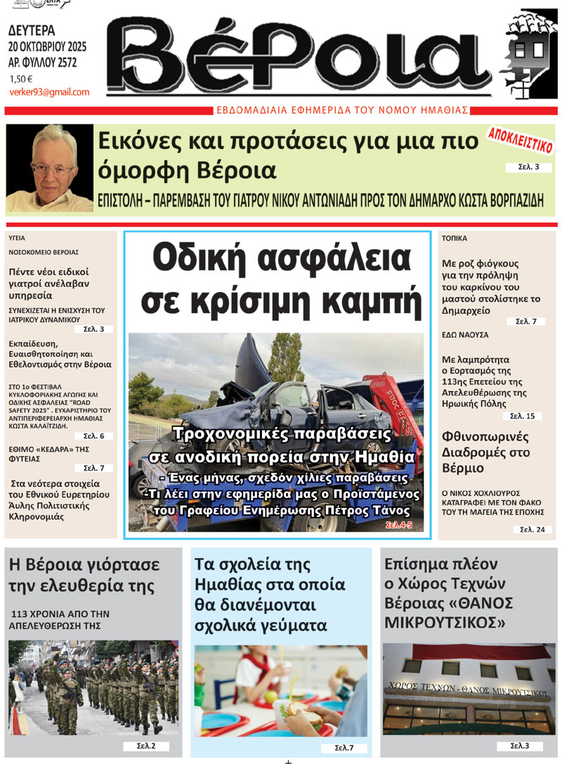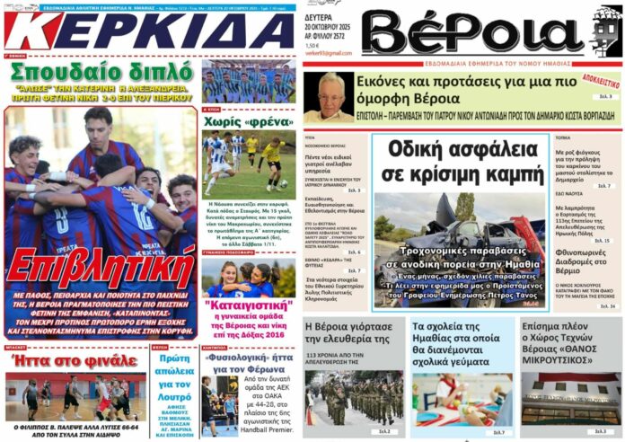 Ημαθία Ημαθία: Τα πρωτοσέλιδα των εφημερίδων “Βέροια” και “ΚΕΡΚΙΔΑ” Από Έμβολος - 20/10/2025 Το πρωτοσέλιδο της εφημερίδας “Βέροια” Το πρωτοσέλιδο της εφημερίδας “ΚΕΡΚΙΔΑ”