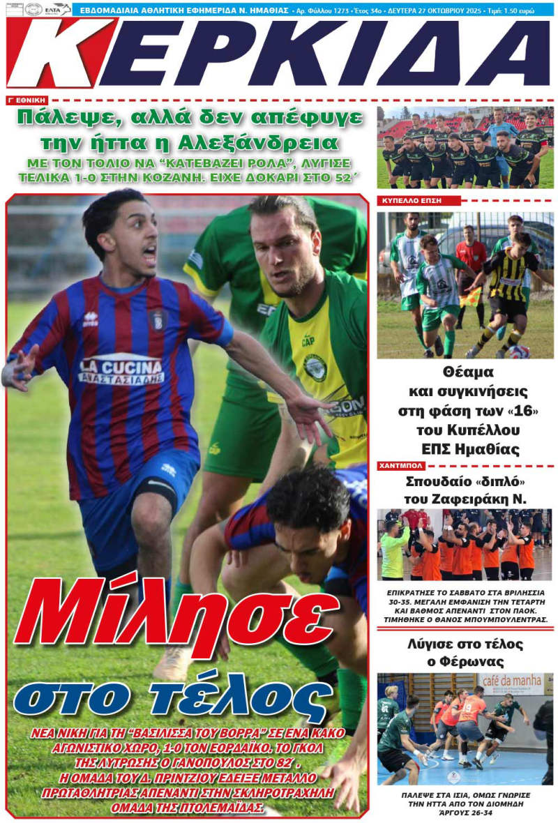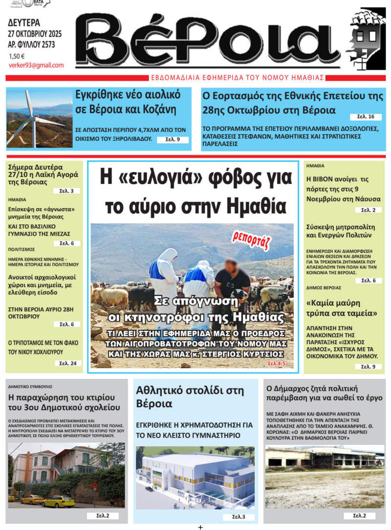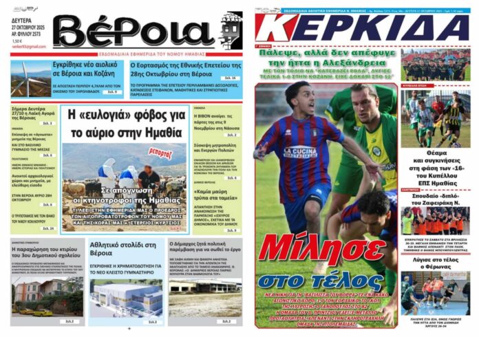 Ημαθία Ημαθία: Τα πρωτοσέλιδα των εφημερίδων “Βέροια” και “ΚΕΡΚΙΔΑ” Από Έμβολος - 27/10/2025 Το πρωτοσέλιδο της εφημερίδας “Βέροια” Το πρωτοσέλιδο της εφημερίδας “ΚΕΡΚΙΔΑ”