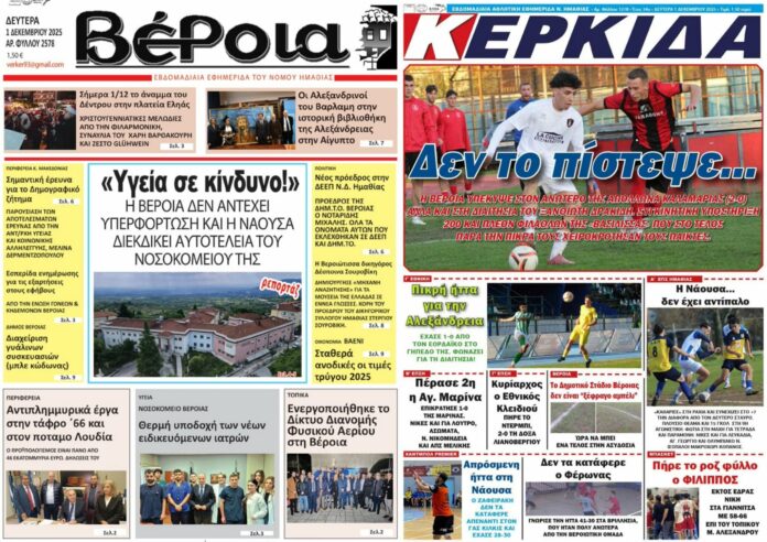 Εφημερίδες Ημαθία: Τα πρωτοσέλιδα των εφημερίδων “Βέροια” και “ΚΕΡΚΙΔΑ” Από Έμβολος - 01/12/2025 Το πρωτοσέλιδο της εφημερίδας “Βέροια” Το πρωτοσέλιδο της εφημερίδας “ΚΕΡΚΙΔΑ”