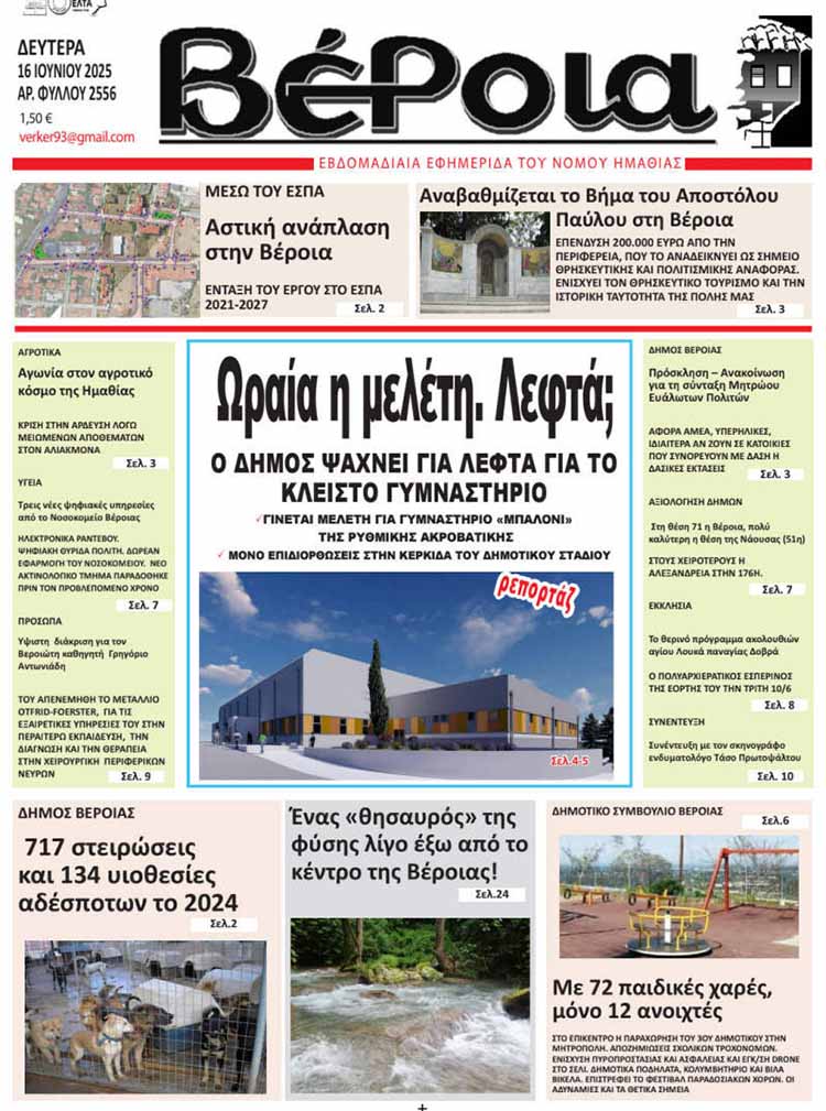 Εφημερίδες Ημαθία: Το πρωτοσέλιδο της εφημερίδας “Βέροια” Από Έμβολος - 16/06/2025 Το πρωτοσέλιδο της εφημερίδας “Βέροια”