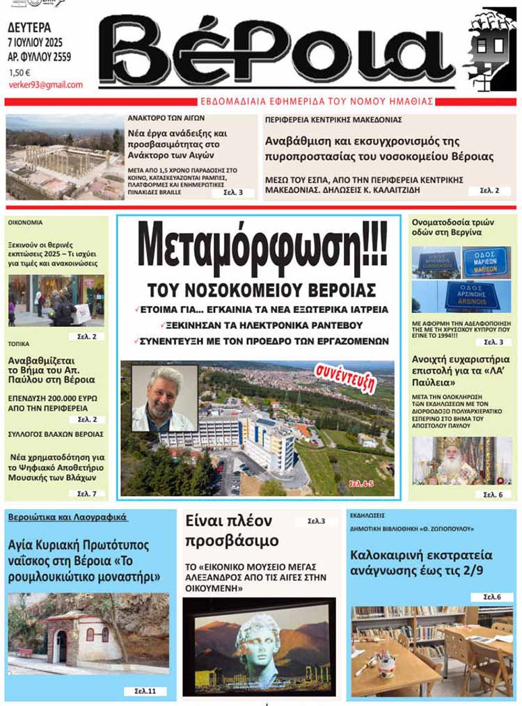 Εφημερίδες Ημαθία: Το πρωτοσέλιδο της εφημερίδας “Βέροια” Από Έμβολος - 07/07/2025 Το πρωτοσέλιδο της εφημερίδας “Βέροια”