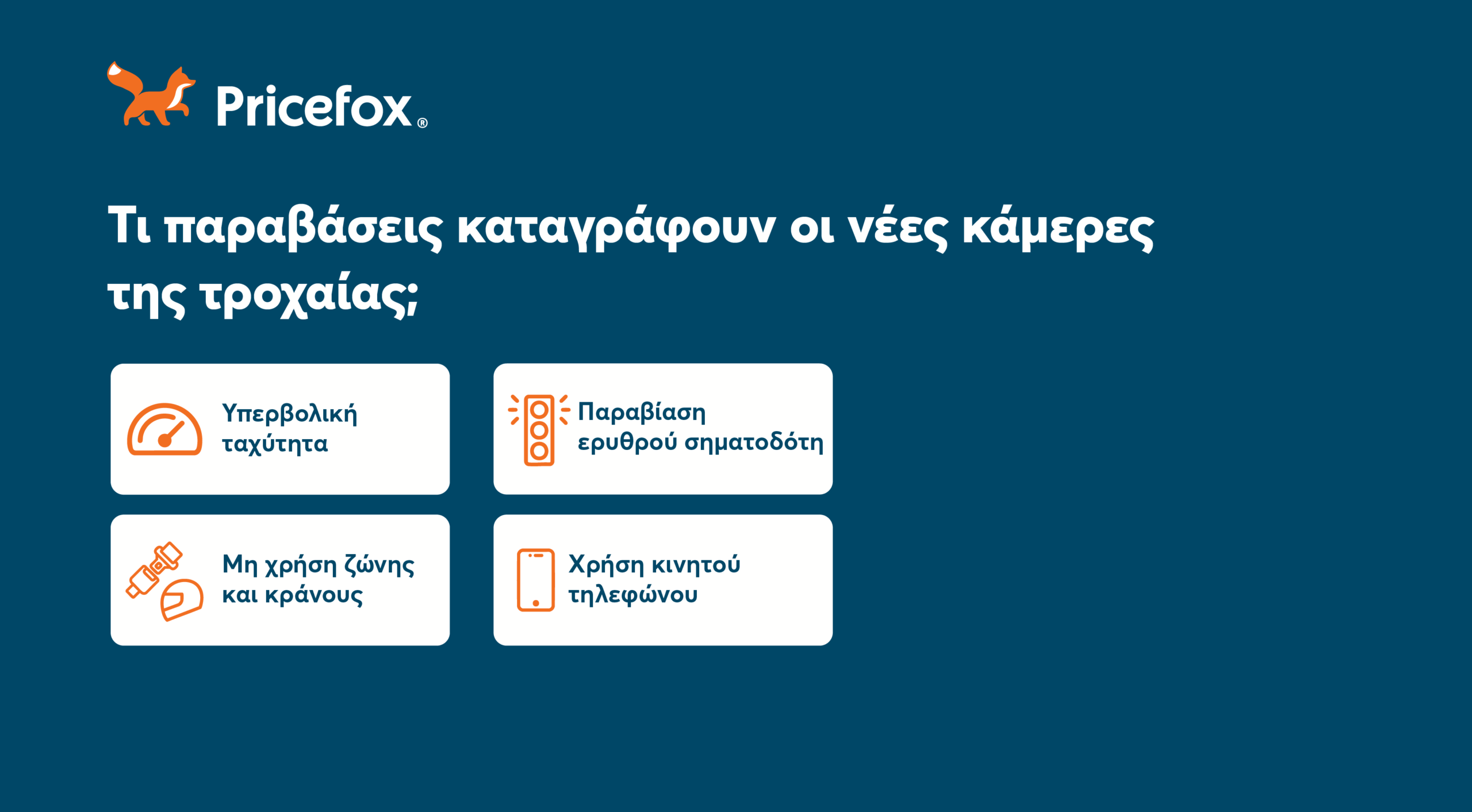 Το Pricefox, η online πλατφόρμα όπου μπορείς να βρεις ασφάλεια αυτοκινήτου με όλες τις απαραίτητες καλύψεις, ενημερώνει τους οδηγούς για τις νέες κάμερες καταγραφής παραβάσεων της τροχαίας.