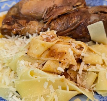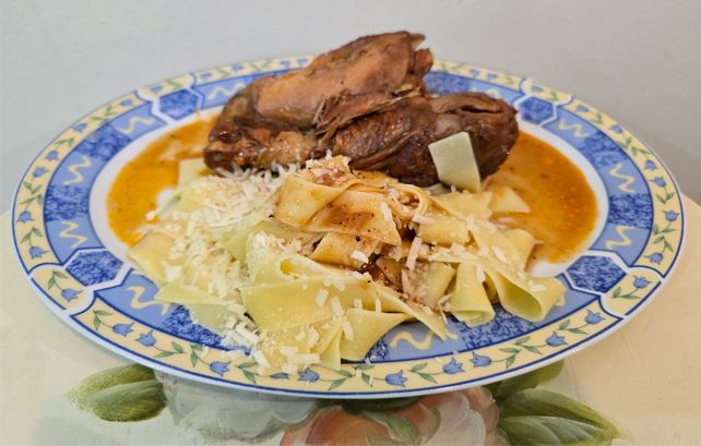 Σε πιάτο βάζουμε τα ζυμαρικά και δίπλα τον κόκορα. Περιχύνουμε με τη σάλτσα και πασπαλίζουμε με τριμμένο κεφαλοτύρι και φρεσκοτριμμένο πιπέρι.