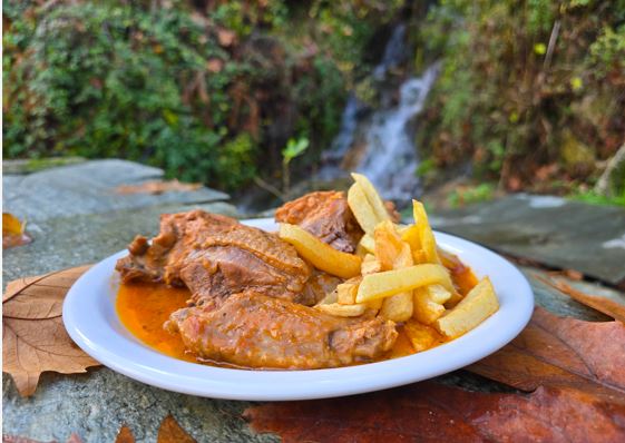 Τον χωριάτικο κόκορα τον απολαύσαμε στο Πήλιο και φωτογραφίσαμε το πιάτο δίπλα στο ρυάκι.