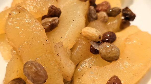 Προσθέτουμε τα μήλα και τις σταφίδες και αφήνουμε να σιγοβράσουν για 20 λεπτά περίπου, μέχρι να μαλακώσουν.